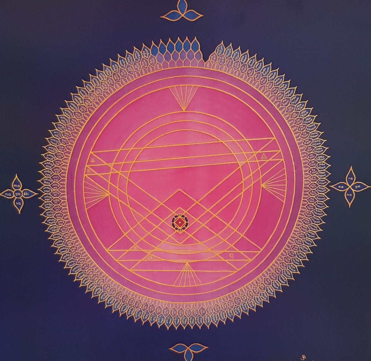 Weiterhin beinhaltet das Yantra 6 Dreiecke und in der Mitte das sogenanne Nada Bindu, eine weitere geometrische Formation, die die Energie durch die Form eines 8-seitigen Brilianten in das All-Wissen führt. Hier verbindet sich alles, was ist, in den einen Zustand von „ich bin „.