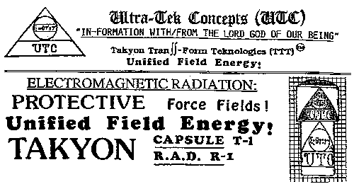 Dies ist der theoretische Rahmen in dem UTC und TTT ihre Konzepte und Takyonen Produkte herstellen. Wir studieren und erforschen die Auswirkungen der Verseuchungen durch elektromagnetische Felder auf das ganze Biosystem - die Menschen, Tiere, Pflanzen und sogar Mineralien, Metalle, Kristalle und Kunststoffe - auch die Auswirkungen auf das Bewußtsein und die Psyche. Obwohl wir akademisch geschult wurden und die gängigen wissenschaftlichen Methoden und Hochtechnologie verwenden, haben wir mit den Richtlinien, Limitationen und dem "Nicht-Machbarsein" der sogenannten "Naturgesetze", die von Physikern und Technikern errichtet wurden, gebrochen. UTC/TTT verwenden sowohl Wissenschaft und Technologie, die auf Gesamt-Masse/Energie basieren, aber auch spezielle feine Energien. Es werden auch unorthodoxe Techniken wie Radikale und Alchimie miteinbezogen.